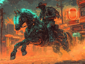 Mechanical steed gallops through dusty town streets, gears whirring, steam hissing, a fusion of machine and beast in a thrilling westernpunk world