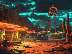 westernpunk neon carnival rusted rides spinning dusk glowing signs flickering eerie nostalgia wonder amusement mechanical steampunk futuristic cybernetic industrial retro festival fair lights automation rustic excitement vintage technology dystopian machinery cybernetics adventure whimsical entertainment surrealImagine Buddy