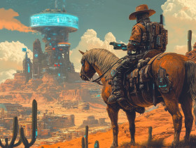 westernpunk holographic tech hums worn machines flickering lights blending futuristic advancements rugged decay cybernetic neon innovation automation steampunk industrial technology retro mechanical dystopian robotics vintage metallic surreal cybernetics glowing gritty hybrid neon-lit eerie urban old dystopiaImagine Buddy