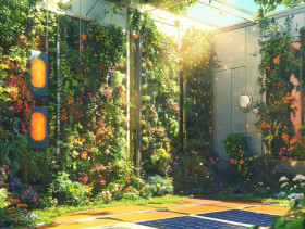 Colorful vertical garden walls filter air, reduce heat, and brighten cityscapes, capturing solarpunk, solar punk aesthetic, and the solar punk movement