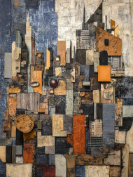 A city skyline crafted from reclaimed materials, forming an abstract assemblage of urban architecture, artistic arman assemblage showcasing sustainability and creativity