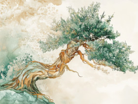 Gnarled bonsai tree stretching its twisted branches toward the sky, symbolizing strength and perseverance, firmly rooted in bonsai soil