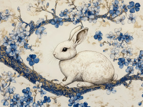A rabbit rests under a blooming cherry tree, surrounded by delicate cibulak porcelain designs, symbolizing spring, renewal, and nature’s beauty