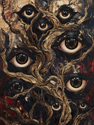 Eyes sprout from tangled tree roots, forming a grotesque tapestry of staring orbs embedded in gnarled wood, watching with an eerie, unnatural gaze