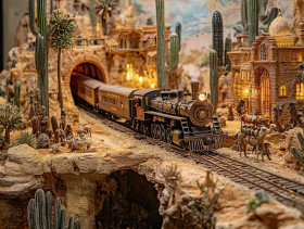 Bustling train station with a departing locomotive in a miniature diorama, symbolizing travel, movement, and history
