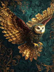 A soaring owl with golden feathered accents spreads its wings mid flight, the glowing plumage adds a mystical touch, symbolizing wisdom and elegance, gilded meaning royalty, regilding details