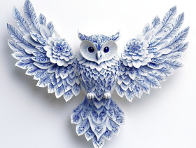 A soaring owl with detailed feather motifs, crafted in the style of gzhel pottery, blending avian grace with gzhel russian porcelain folk patterns