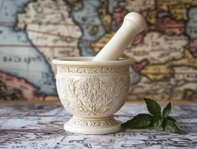 A mortar and pestle with engraved herbal motifs, scrimshaw artistry, detailed botanical carvings, traditional apothecary tool