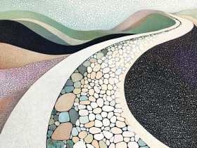 A curved pathway with stippled textures on stones, leading through a scenic landscape, the stippling technique enhances the rugged stone details and depth