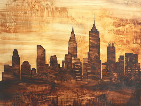 pyrography rustic city skyline architectural silhouettes burned wood urban landscape artwork handcrafted decor design engraving illustration structure metropolis building scenery woodwork traditional downtown detail handmade texture pattern vintage silhouette pyrographywood unique carving creation etching masterpieceImagine Buddy