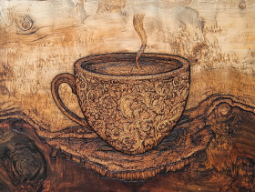 pyrography coffee cup burned wood steaming drink design handcrafted decor rustic cafe art engraving aroma illustration pattern texture woodwork shop handmade detailed warm breakfast beverage morning roasted inspiration pyrographywood caffeine cozy unique dining etchingImagine Buddy