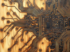 Circuit board woodburn design, intricate electronic pathways burned into wood, technology inspired engraving, handcrafted pyrography wood, pyrography art
