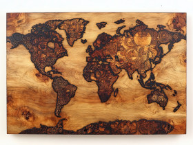 World map burned onto a wooden board, detailed continents, handcrafted pyrography wood, travel inspired engraving, pyrography art, rustic global decor
