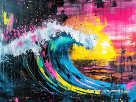 sunset wave spray paint style ocean motion warm hues dynamic splash effect aerosol art custom details street mural sea fluid creative bright vibrant abstract colorful flow water surf foam sunset horizon marine energy liquid modern artisticImagine Buddy