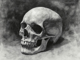 Anatomical skull in deep tones, hollow eye sockets and fine bone details, charcoal drawing capturing realism, created with charcoal pencils, and charcoal art