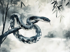 snake coiled tree branch sinuous expressive strokes chinese ink brush painting wisdom transformation mysterious traditional artistic detailed nature reptile elegance movement power subtle symbolic oriental predator motion spiritual wild monochrome fluid fine mystic resilience deepImagine Buddy