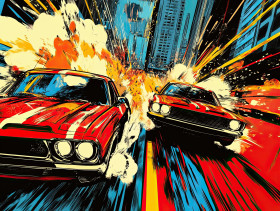 high speed car chase city streets engines roaring tires screeching pursuit adrenaline action fast motion urban dangerous pursuit dramatic traffic neon blur intensity cinematic night thrilling rush comic book style 3d anime comics dynamic reckless streetImagine Buddy