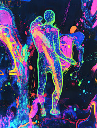 figures dancing neon glowing blacklight paint acrylic movement energy dynamic artistic surreal colorful vibrant night glowing abstract dreamlike illuminated festival creative celebration futuristic cosmic glowing modern fantasy luminescent spirit visual flowing aesthetic expressive joyful performanceImagine Buddy