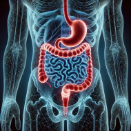 Medical digital illustration of the human digestive system, featuring the stomach, intestines, and liver, concept of digestion, nutrition, and gastrointestinal health