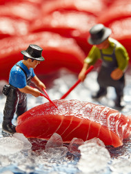 miniature workers food photographs fishermen sashimi tuna sushi ice tray fresh seafood tiny preparation raw gourmet cuisine delicacy arrangement slicing plating artistic elegant culture dining styling texture craftsmanship concept teamwork creative japanese traditional fresh seafoodImagine Buddy