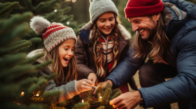 Children help decorate christmas tree in snowy forest, christmas stock image ai, christmas stock photos ai