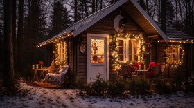 A small cottage in the forest all lit up for christmas, christmas stock image ai, christmas stock photos ai