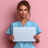 nurse holding separate blank white panel pink background people placards healthcare awareness medical message social campaign hospital patient professional care industry uniform statement nurse clinical wellness safety advocacy isolated doctor support communication charity prevention service humanity healthyImagine Buddy