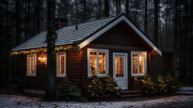 Charming cottage in the snow with christmas trees, christmas stock image ai, christmas stock photos ai