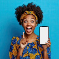 vibrant african woman excited smartphone blank screen mobile advertisement stock photo technology digital communication device touchscreen large isolated holding hand portrait modern person happy cheerful presenting showcasing commercial electronic innovation interactive wireless internet trendy lifestyleImagine Buddy