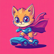kitten cat fluffy superhero cape hoverboard gliding confident tiny cute animal rider flat icon adventure hero fun playful movement trendy design speed motion stylish flying fantasy pet young charming energetic sporty cartoon excitement whimsical athletic comic outdoorImagine Buddy