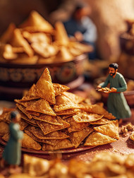 Golden, flaky baklava stacked neatly on a vibrant table, with six workers, eid al fitr miniature workers food photography