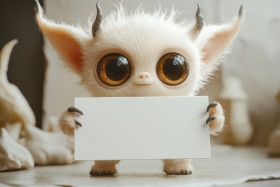 Adorable baby monster with tiny horns holds blank sign in modern art gallery pixar, studio ghibli style design with creative ambient focus