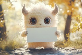 Adorable baby monster with soft fur and bright eyes holds blank sign in sunny park pixar, studio ghibli style creature made for charming ad space