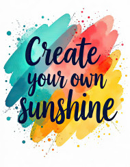 Motivational quote create your own sunshine in bold typography on a splash-ink background with turquoise, coral, mustard yellow, and navy blue. modern, high-contrast art