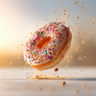 Glazed donut with rainbow sprinkles flying mid-air with crumbs, vivid texture, clean background, golden bokeh, flying food motion, macro food photography
