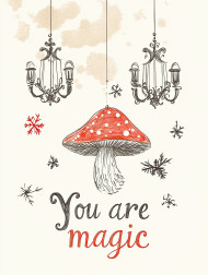 Hand-drawn tiny mushroom sketch with two vintage chandeliers and a red snowflake. "you are magic" in playful text. cozy beige background with pencil shading and red accents. whimsical ai art, motivational text art, midjourney sketch prompt.