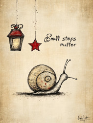 Hand-drawn snail sketch with one vintage lantern and a red star. "small steps matter" in playful text. cozy beige background with pencil shading and red accents. whimsical ai art, motivational text art, midjourney sketch prompt.