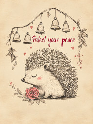 Hand-drawn hedgehog sketch with four vintage bells and a red rose. "protect your peace" written in playful font. warm beige textured paper with soft pencil shading and red accents. sketch journal art, whimsical ai art, motivational text art.