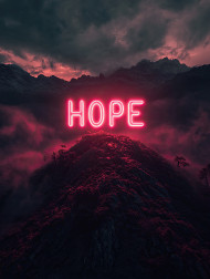 Neon "hope" glowing on a mountain ridge at dusk, surrounded by low clouds and soft shadows. dreamy haze, cinematic lighting, and symmetrical composition create this neon text art, a dreamy landscape, and midjourney prompt.