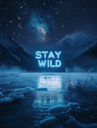 Neon "stay wild" on a frozen lake under moonlight, surrounded by shimmering frost and glowing stars. cinematic lighting enhances the dreamy landscape, with neon text art and a midjourney prompt.