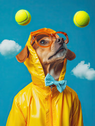 A surreal pop art portrait of a dog in a yellow raincoat with oversized glasses. floating tennis balls and clouds add a playful, dreamlike quality to this whimsical pop art character portrait.