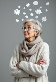 Elderly woman in soft knit sweater and scarf stands still with gentle look, realistic thoughtful people overlays flux prompt fits cozy reflective scenes