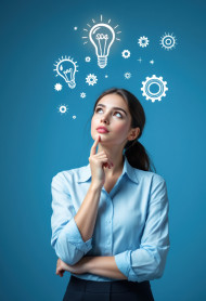 Young woman in smart-casual office wear stands mid-frame with calm expression, realistic thoughtful people overlays flux prompt helps with emotion-based projects