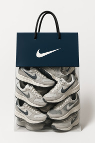 Glossy navy blue carry bag with nike logo showing running shoes inside, placed on white background with soft light. branded bag chatgpt prompt carry bag product mockup packaging design branding