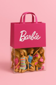 Fuchsia barbie bag with dolls and accessories visible in clear lower half on pastel pink background. branded bag chatgpt prompt carry bag product mockup packaging design branding