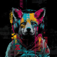 fox graffiti portrait animal headphones neon splatter paint street art urban grunge tshirt design banksy pop art expressive anthropomorphic black background vibrant red cyan magenta yellow dripping bold cap artist realism streetwear headgear modern wild graphic popculture midjourney prompt bold colorsImagine Buddy