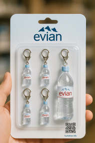 Evian blister pack with miniature bottle keychains. clean water-style product packaging with pastel tones. realistic tiny product design via chatgpt prompt