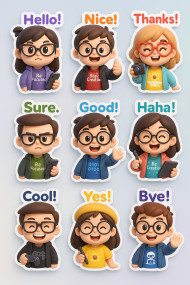 3d kawaii canvas of nine chibi stickers with speech bubbles, pastel gradient background, fun poses and outfits. cute chat sticker pack prompt via chatgpt anime-style