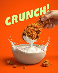 chicken drumstick crispy ranch sauce crunch hand splash fried comic savory bold orange juicy snack pull visual digital food crunchy exaggerated tasty ad fun style marketing midjourney ai boldness creative dinner dip clean flavor texture crispygoldenImagine Buddy