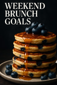 Stack of fluffy blueberry pancakes with syrup on dark moody backdrop, “weekend brunch goals” text. viral pins, pin ideas, image prompts, social media visuals, content creation